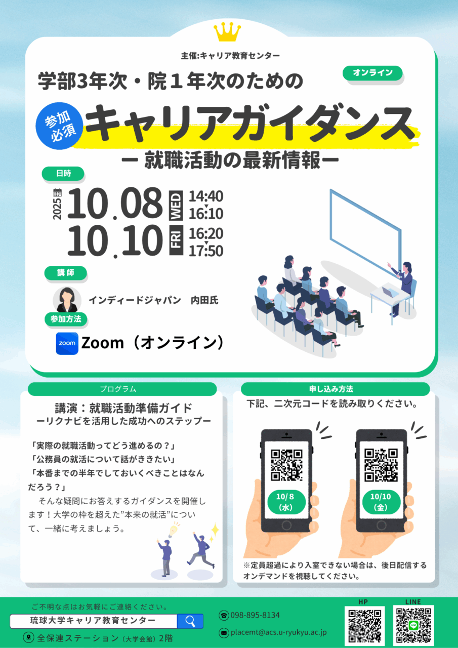 琉大キャリア教育センターから「10/8(水)・10/10(金)キャリアガイダンス」のお知らせです。