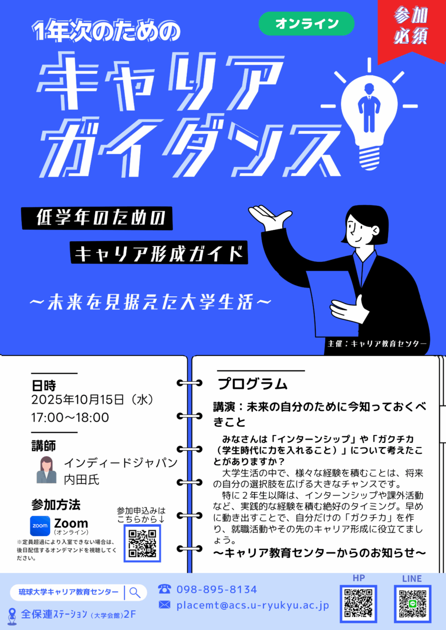 琉大キャリア教育センターから「10/15(水)キャリアガイダンス」のお知らせです。