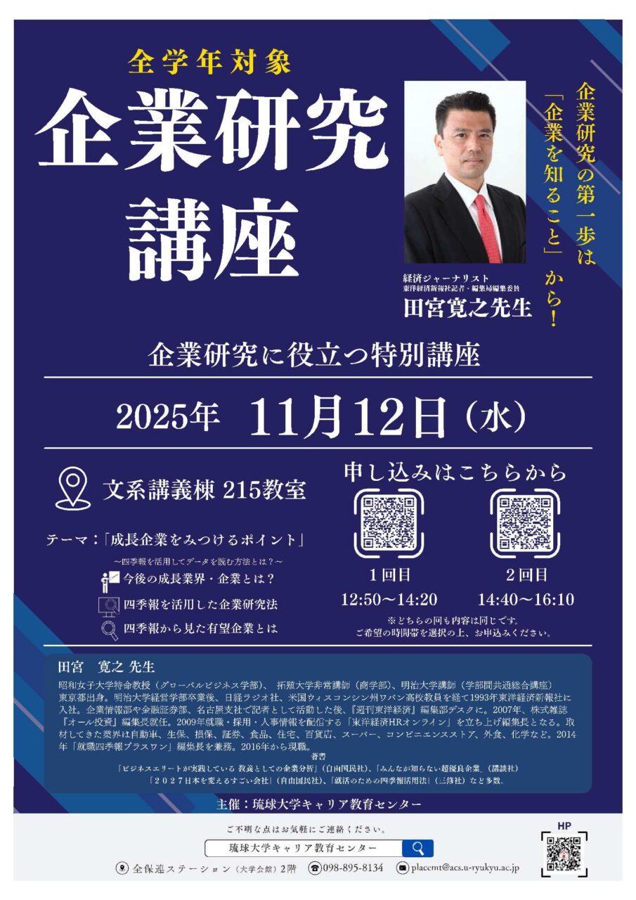 琉大キャリア教育センターから「11/12(水)企業研究講座」のお知らせです。