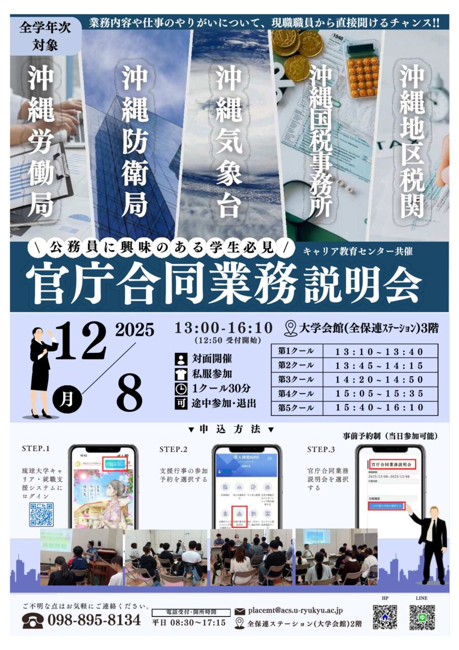 琉大キャリア教育センターから「12/8(月)官庁合同業務説明会」のお知らせです。