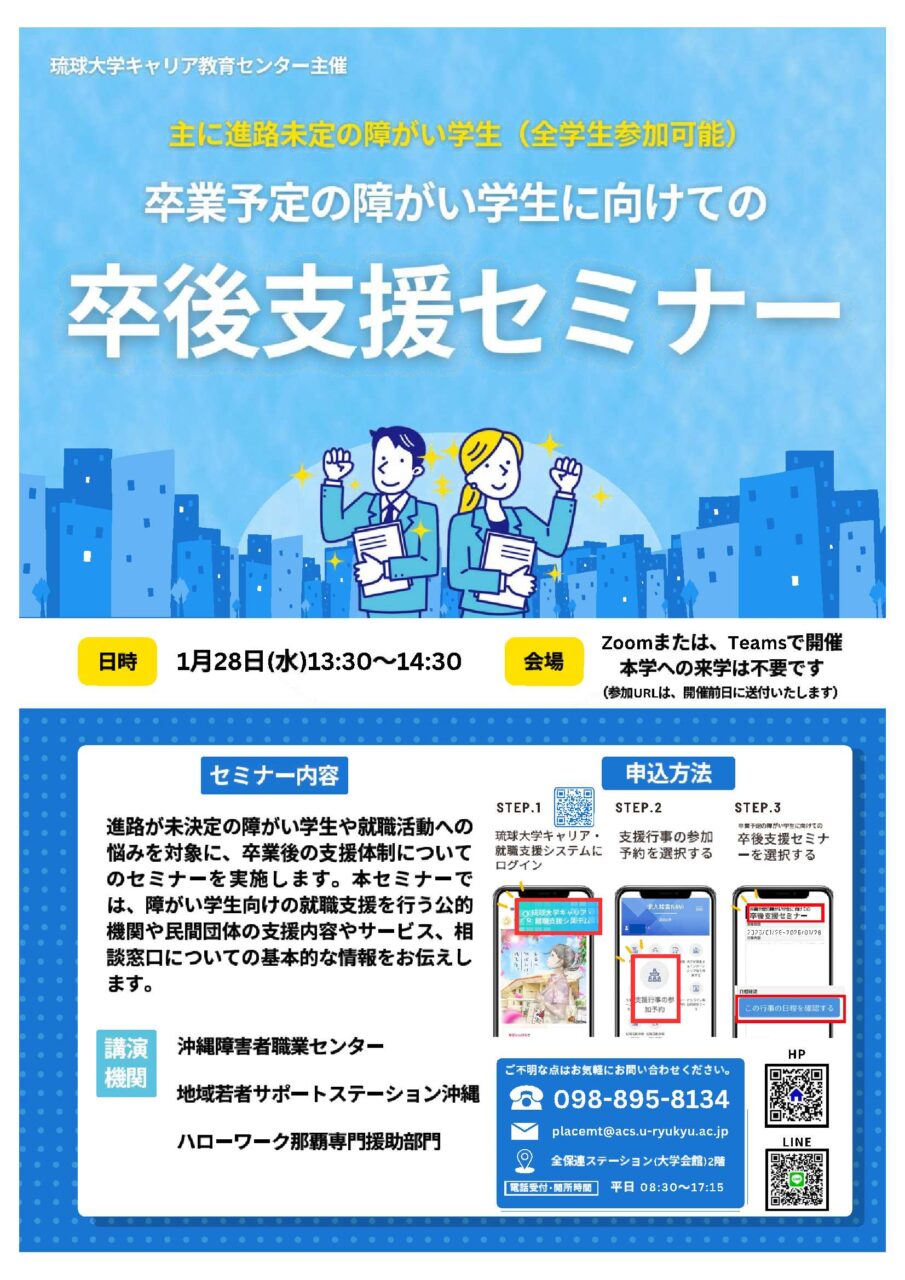 琉大キャリア教育センターから「1/28(水)卒業予定の障がい学生に向けての卒後支援セミナー」のお知らせです。