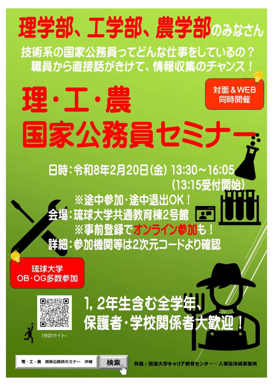 琉大キャリア教育センターから「2/20(金)理・工・農 国家公務員セミナー」のお知らせです。