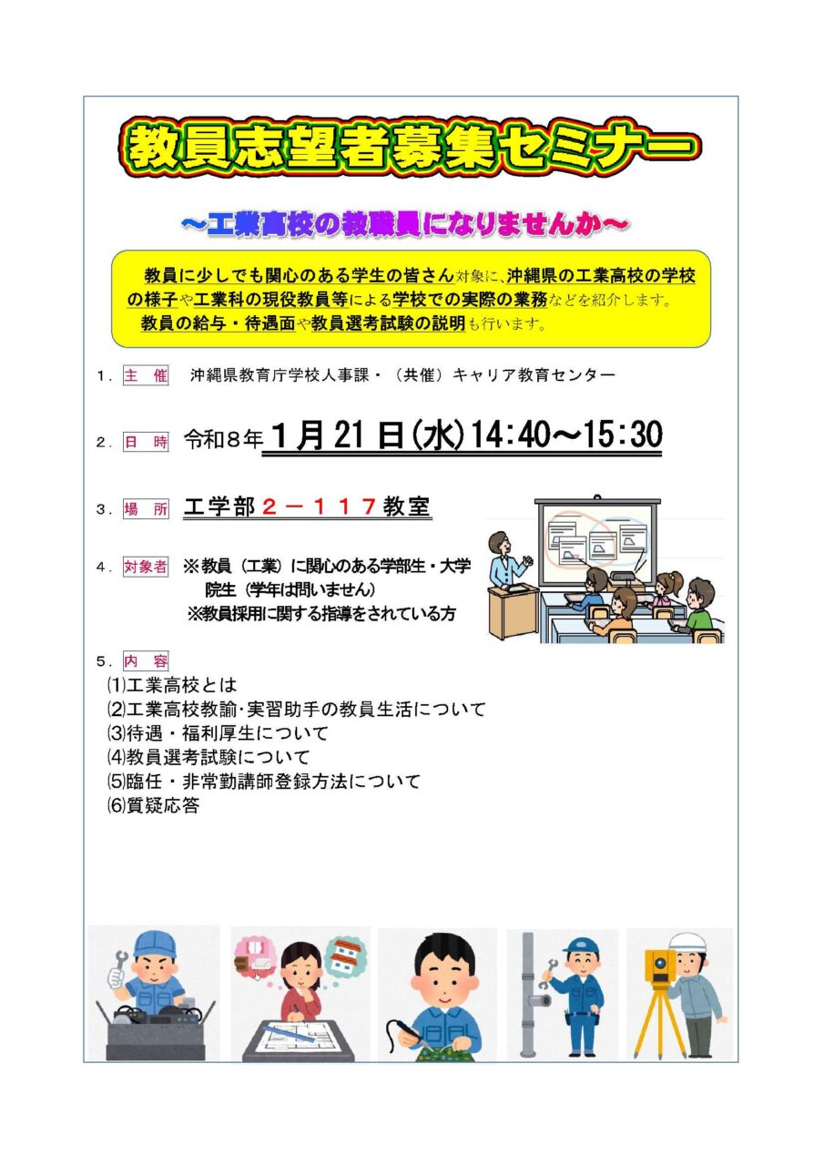 琉大キャリア教育センターから「2/21(水)教員志望者募集セミナー」のお知らせです。