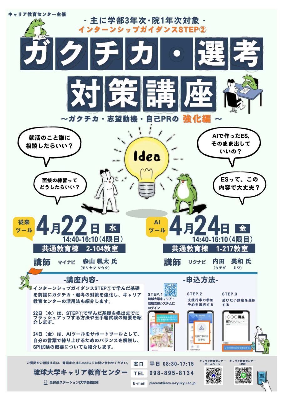 琉大キャリア教育センターから「4/22・4/24★ガクチカ・選考対策講座」のお知らせです。