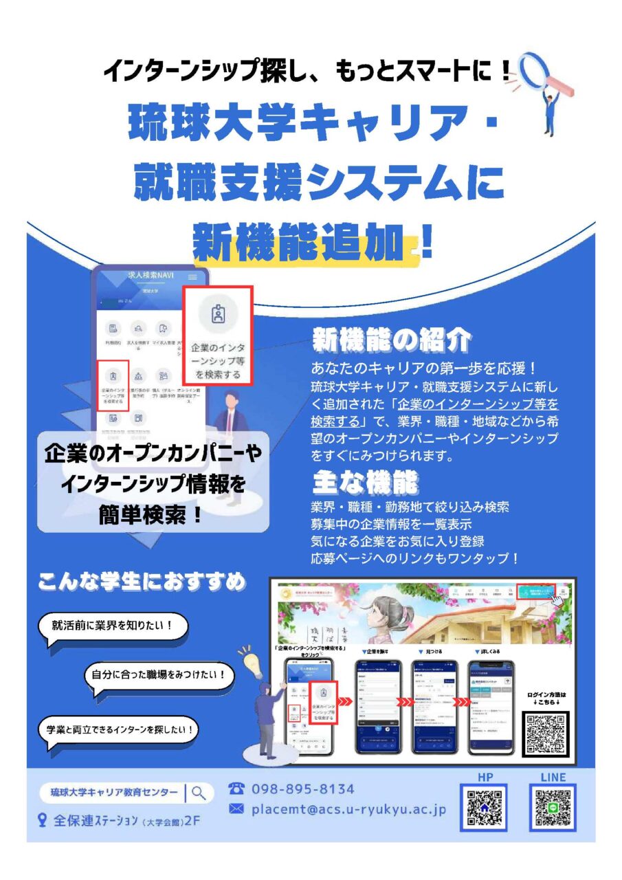 琉球大学キャリア・就職支援システムに新しく追加された「企業のインターンシップ等を検索する」で、業界・職種・地域などから希望のオープンカンパニーやインターンシップをすぐにみつけられます。