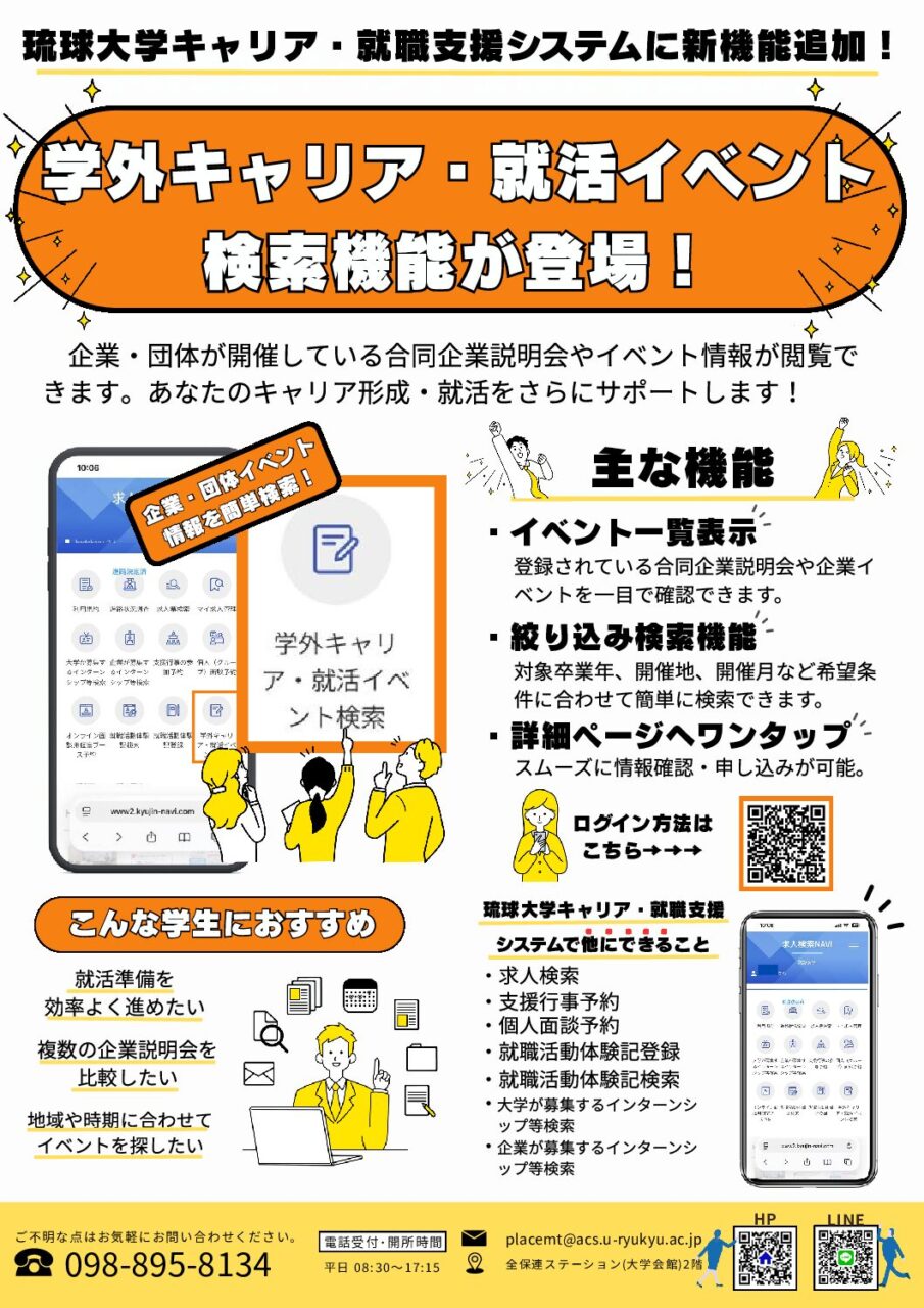 琉球大学キャリア・就職支援システムに新しく追加された「学外キャリア・就活イベント検索機能」で、企業・団体の開催している合同企業説明会やイベントが検索できます。