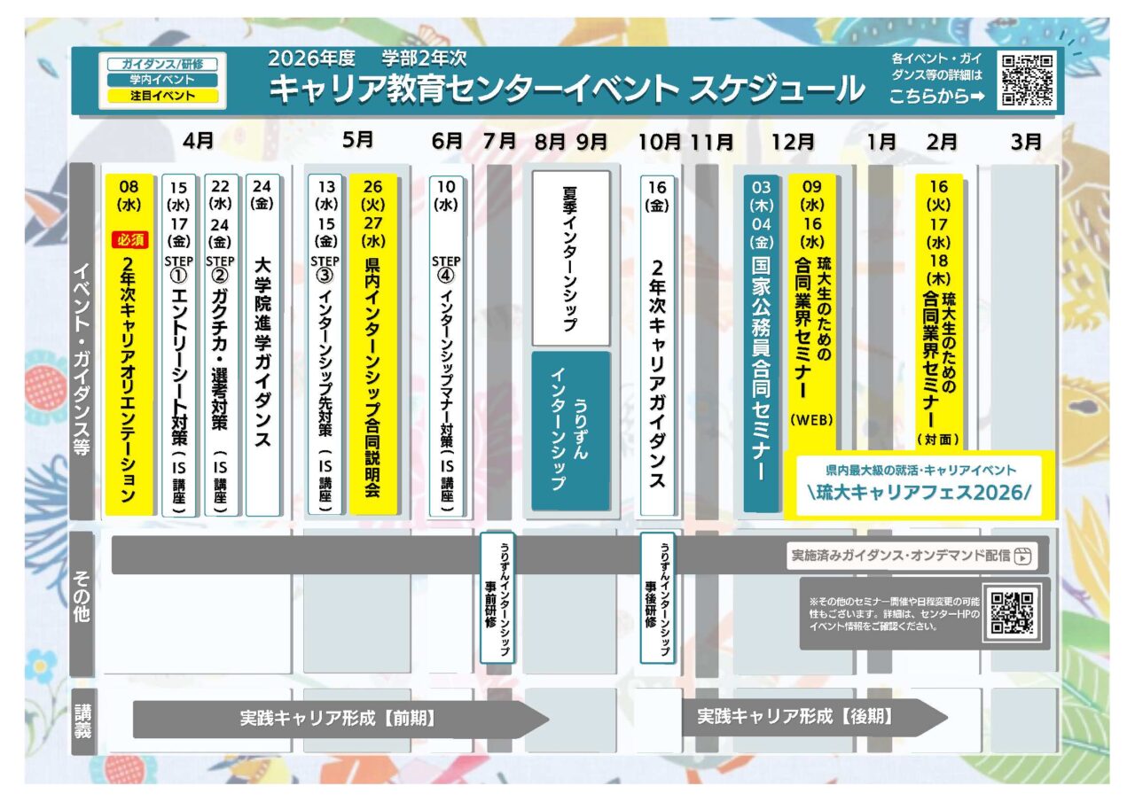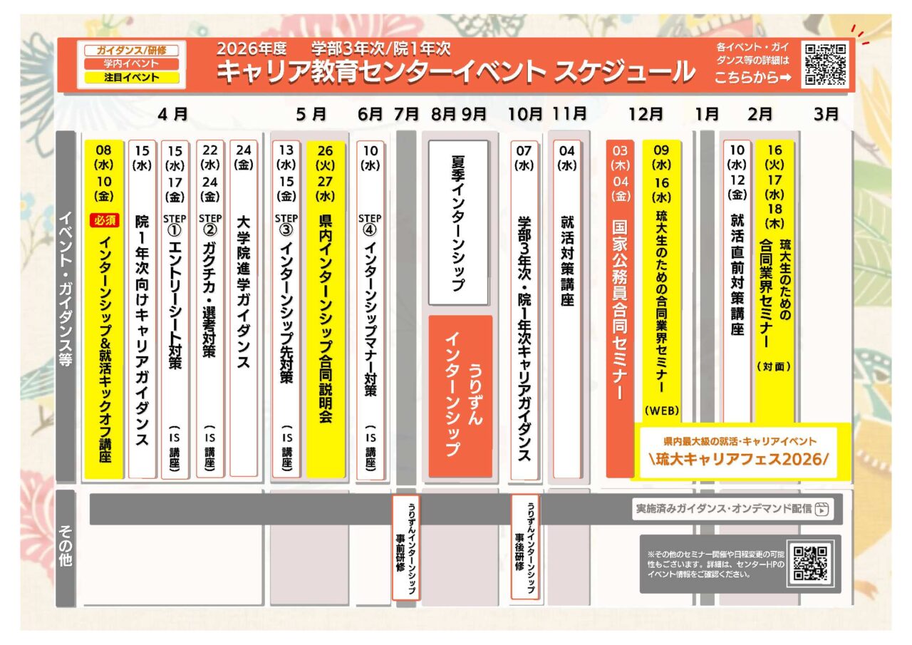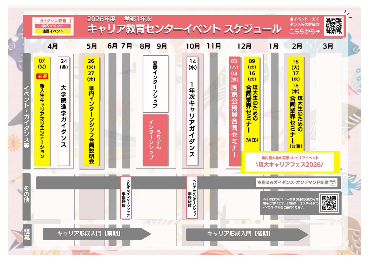 各イベントの情報更新については、キャリア教育センターホームページ、キャリア・就職支援システム、LINE、学内掲示板(デジタルサイネージ)、教務情報システム、琉大ポータルで今後お知らせします。