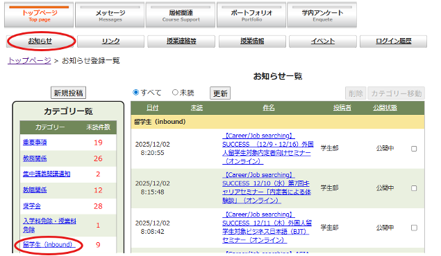 国際教育課が教務情報システムのお知らせ「留学生(inbound)」に掲載している就職ガイダンス、就職セミナーや講座等を受講ください。